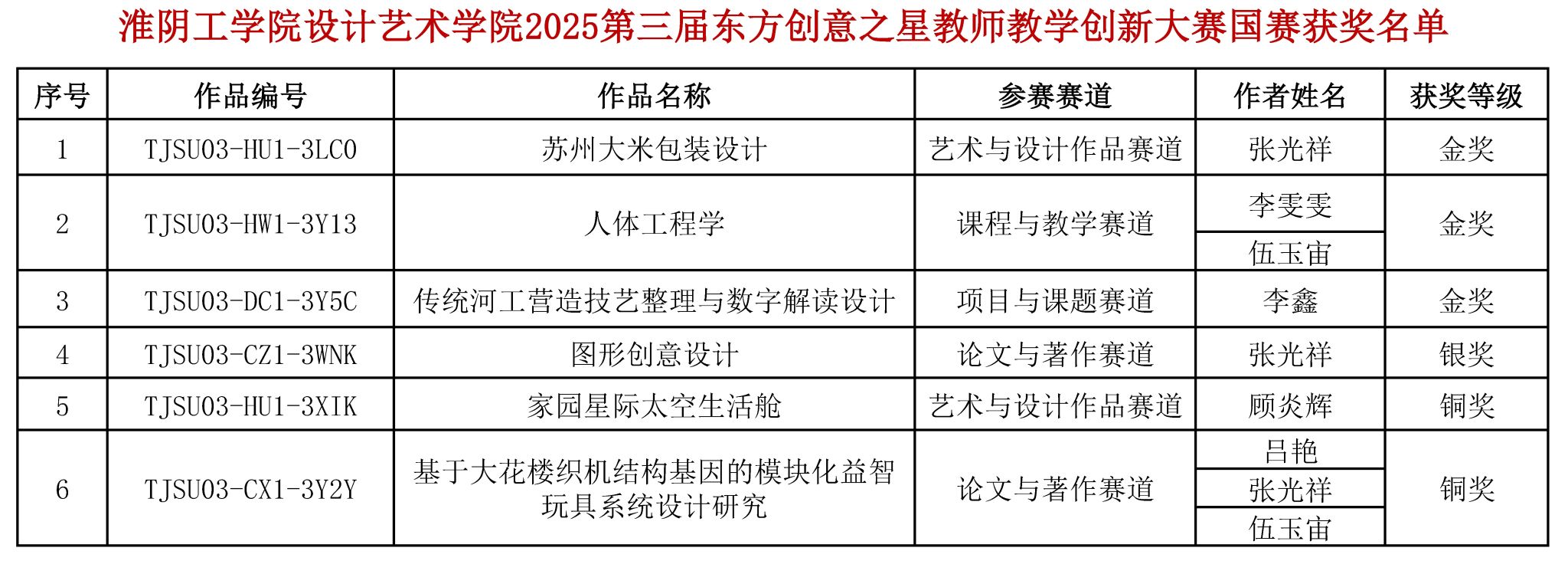 11月9日,第三届东方创意之星教师教学创新大赛全国赛在江苏大学落下帷幕。经过校赛、省赛的层层选拔与国赛终评的激烈角逐,我院设计艺术学院参赛教师凭借扎实的专业素养、突出的教学创新能力和良好的综合表现,在本届赛事中取得优异成绩。《苏州大米包装设计》《人体工程学》《传统河工营造技艺整理与数字解读设计》三件作品荣获金奖,《图形创意设计》获银奖,《家园星际太空生活舱》《基于大花楼织机结构基因的模块化益智玩具系统设计研究》获铜奖。