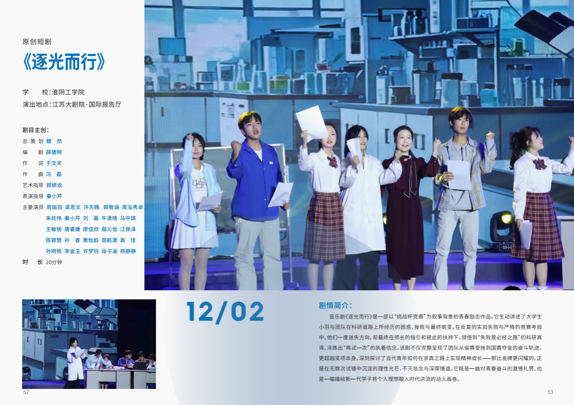 《逐光而行》是以“挑战杯”赛事为原型创作的音乐短剧,我校教师薛建明、于文天、冯磊、顾妍龙、秦小芹等合作完成作词、作曲、剧情撰写、舞蹈编排、表演指导等核心工作。