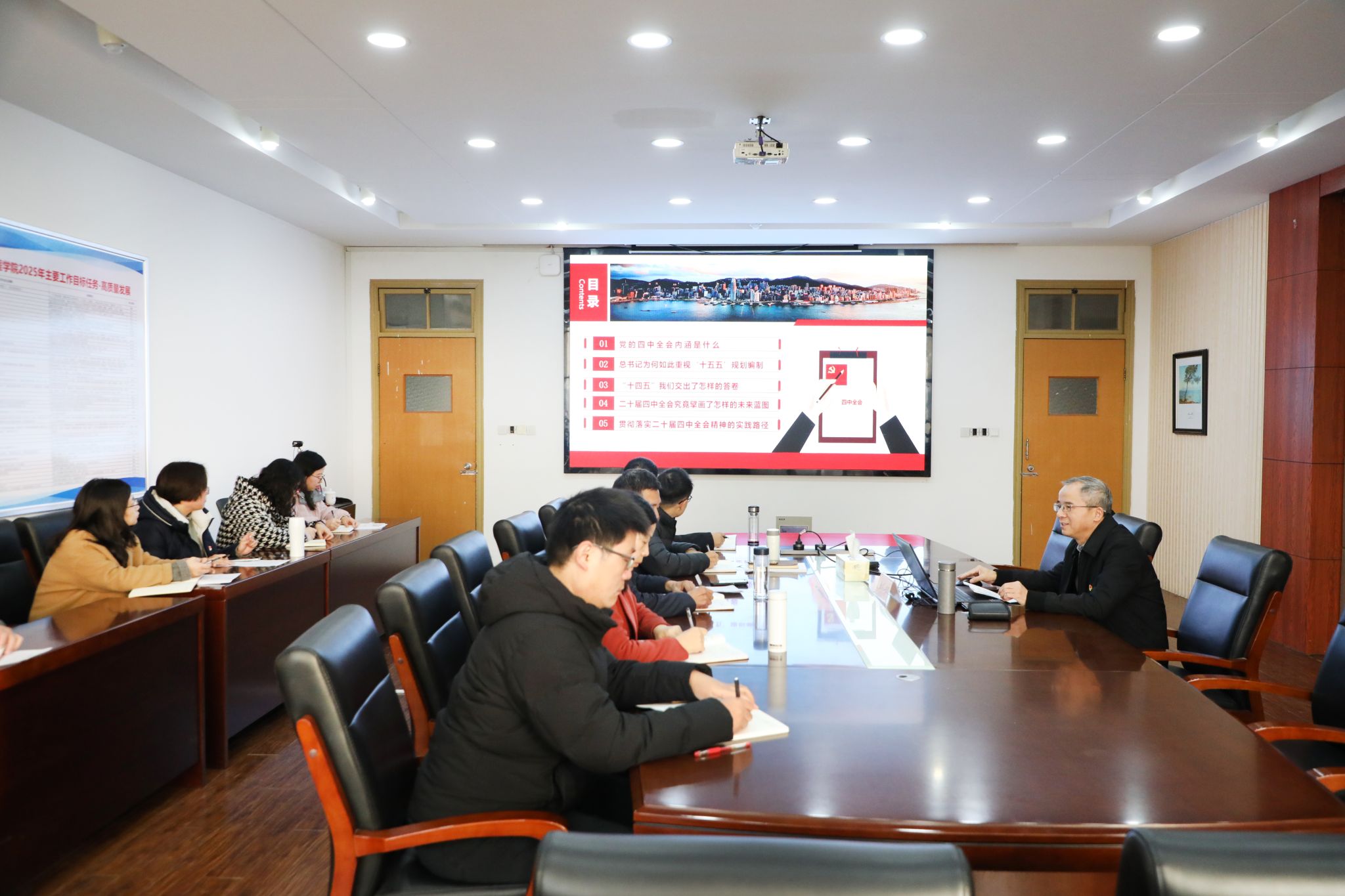 校领导以“深悟二十届四中全会精神实质 扛起“十五五”奋进新使命”为主题,从党的二十届四中全会核心内涵、“十四五”发展成就、“十五五”规划编制意义、未来蓝图和实践路径等方面,紧密结合学校实际,对全会精神进行全面系统地宣讲和深入浅出地阐释。
