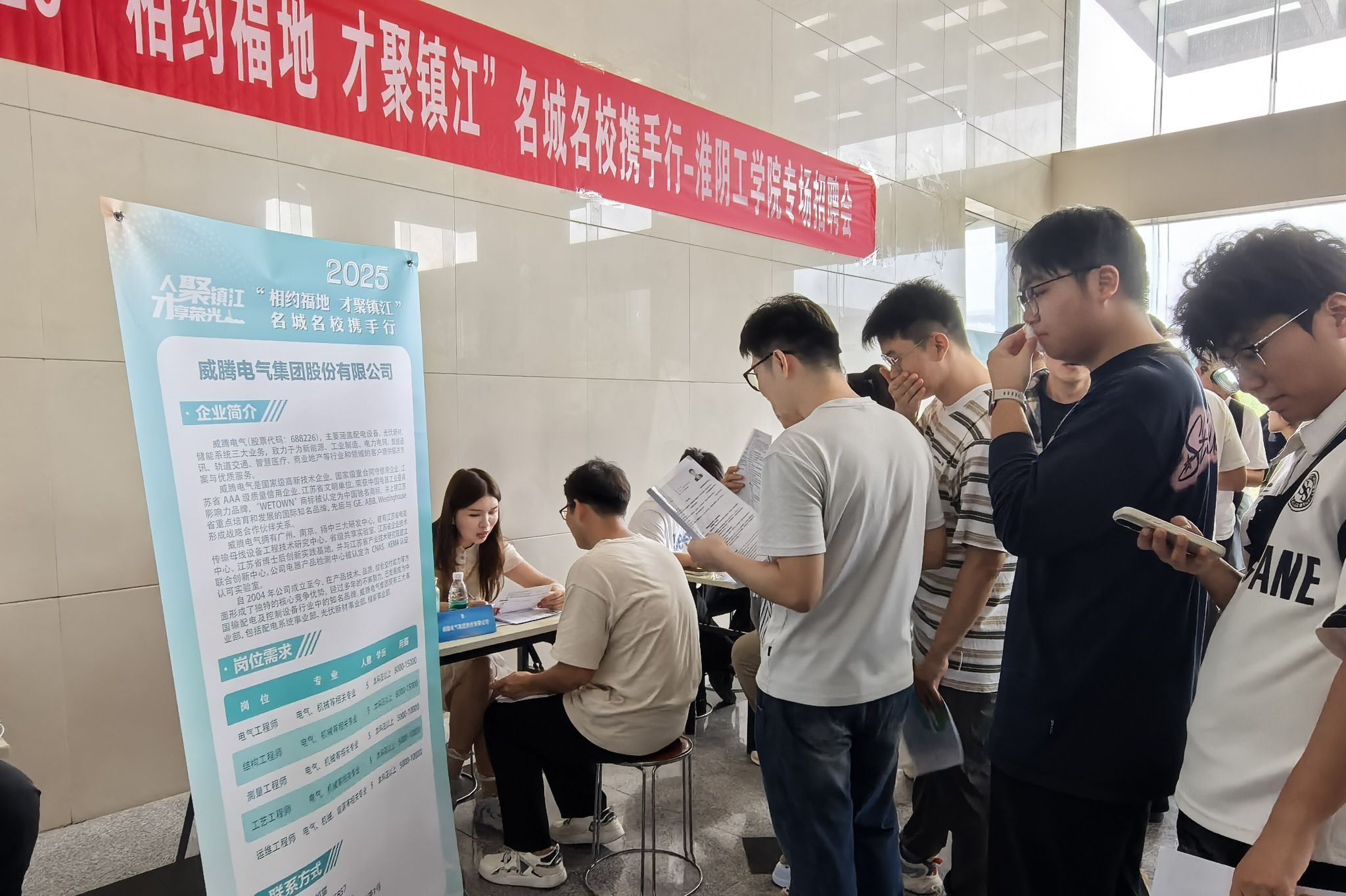 本次招聘会由我校与镇江市人力资源和社会保障局共同举办,突出“服务新质生产力 校地强链促就业”的特色,邀请到大津重工、蜂巢动力、伊顿母线、威腾电气等22家企业前来招聘,共提供机械、电气、自动化、土木工程、计算机、外语等近600个工作岗位。