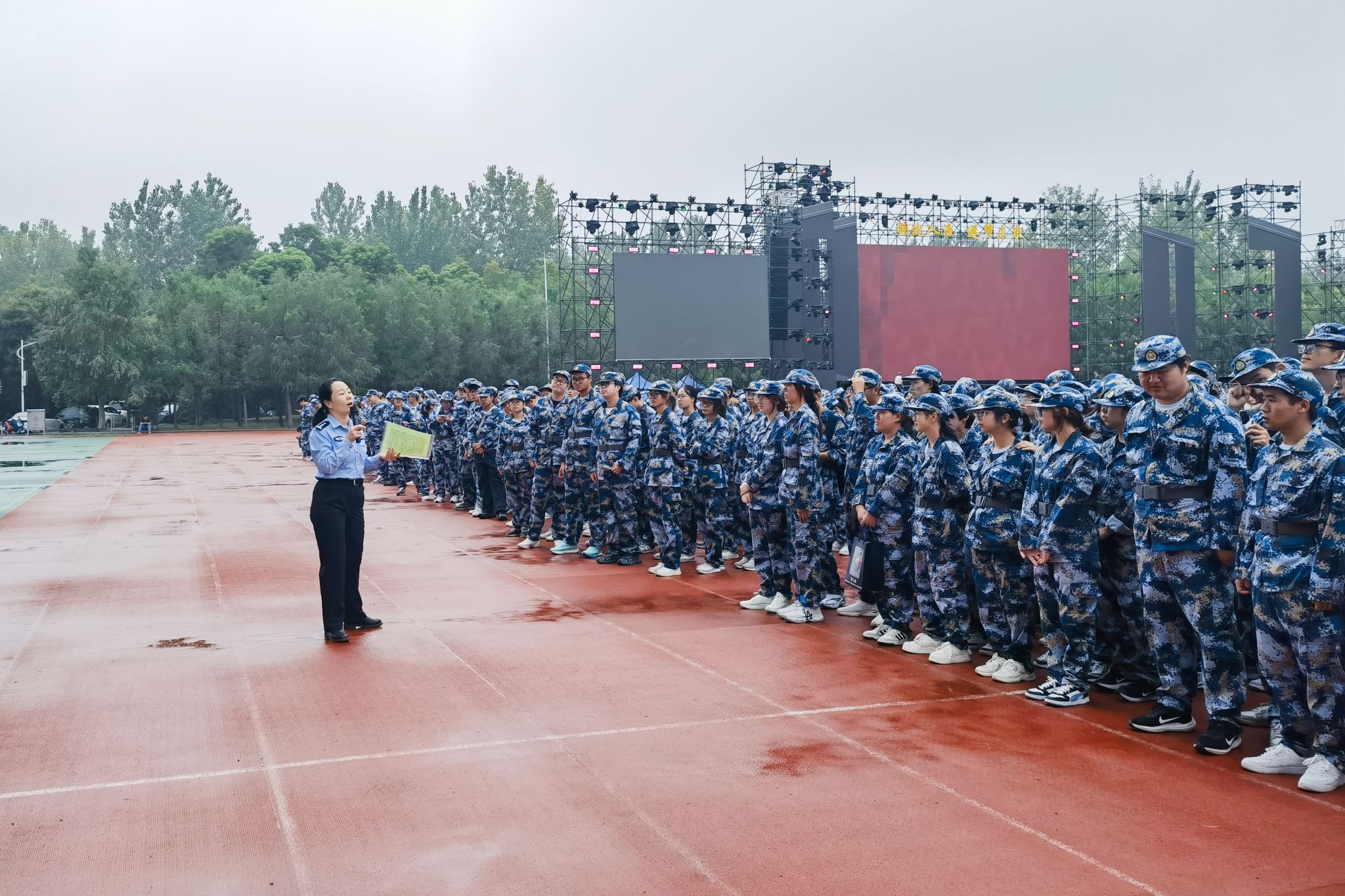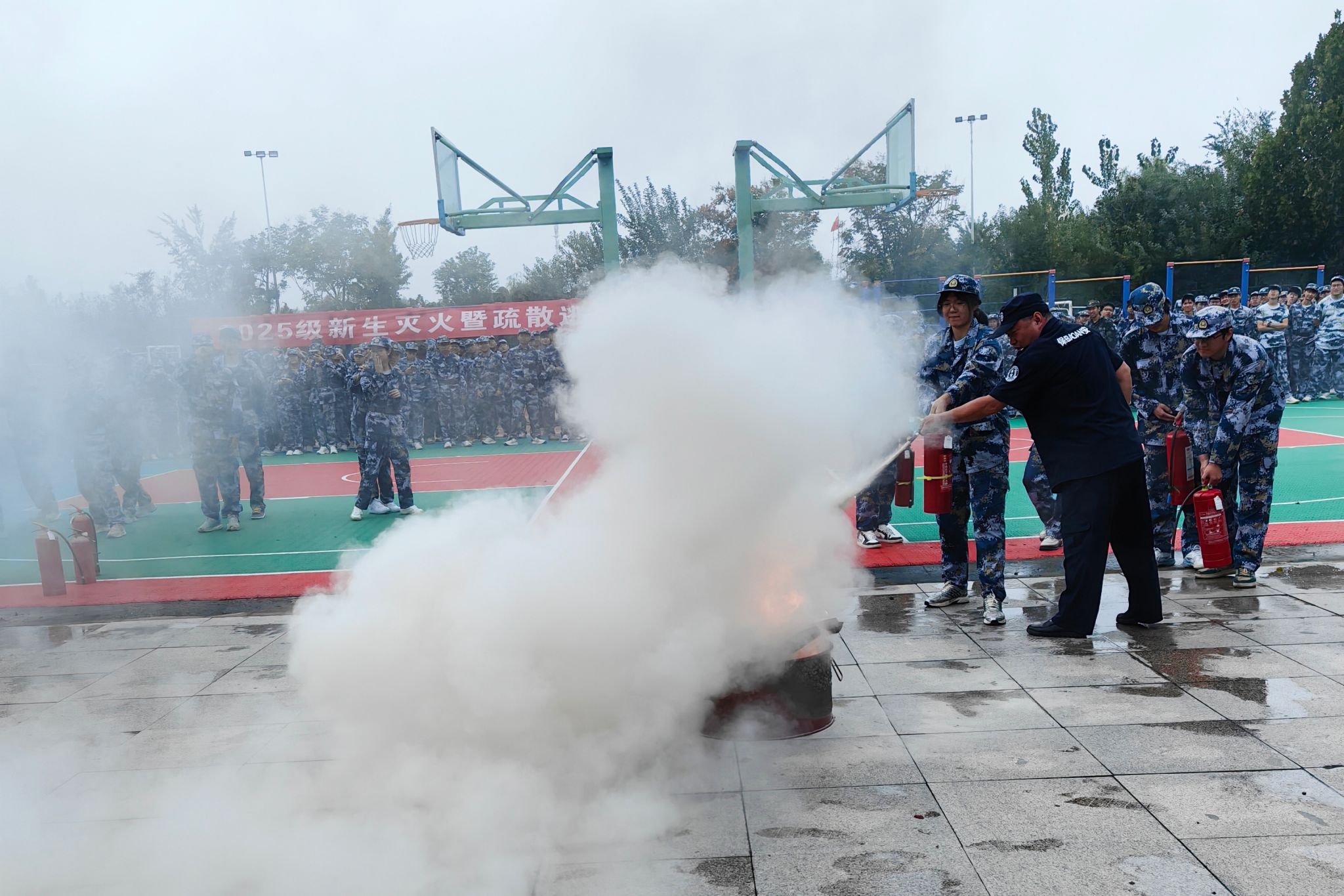 火灾疏散逃生演练环节,军训教官率先带领参演学生进入体育馆,整齐列队等候指令。演练启动信号发出后,保卫工作人员迅速在馆内及门口点燃烟雾弹,模拟真实火情;消防车同步鸣笛到场,消防员操作水枪展开模拟灭火。在教官与工作人员的引导下,学生们低姿弯腰、快速有序撤离,仅用5分钟便全部抵达操场集合,有效锻炼了了紧急逃生能力。