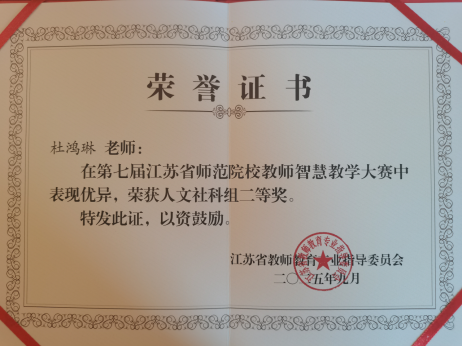 近日,由江苏省教育厅主办,江苏省教师教育专业指导委员会协办,南京师范大学承办的第七届江苏省师范院校教师智慧教学大赛决赛落幕。我校设计艺术学院学前教育专业教师杜鸿琳在大赛中荣获二等奖,表现出扎实的专业素养和智慧教学能力。