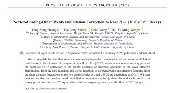 近期,我校数理学院教师王超联合南开大学教授王玉明、中国海洋大学教授沈月龙,在国际物理学期刊《Physical Review Letters》发表研究论文《Next-to-Leading-Order Weak Annihilation Correction to Rare B→{K, π}ℓ+ℓ-Decays》。此次为王超2023年以来第3次在该期刊发表论文。