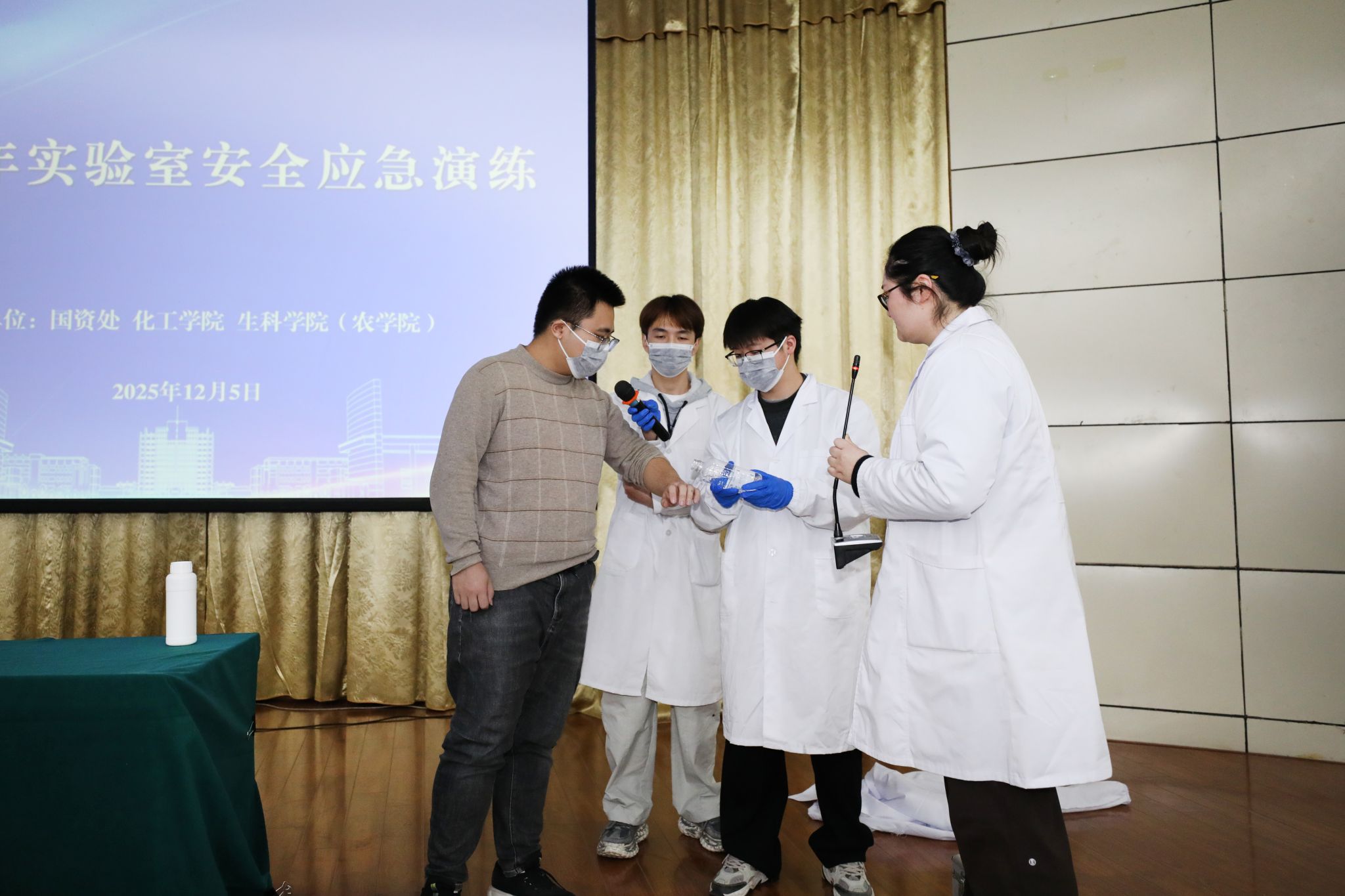 保卫处、国资处有关人员,各教学科研单位实验室分管负责人、实验室主任、实验室管理人员以及部分涉化二级学院学生代表共200余人参加培训和现场演练。