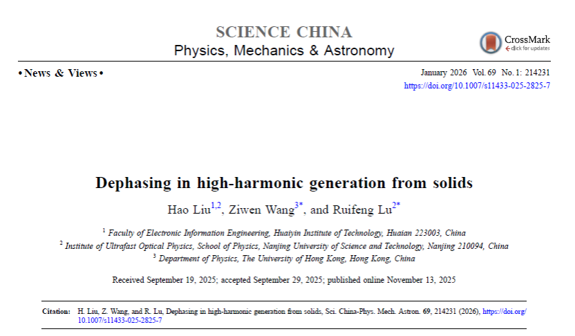 近日,我校电子信息工程学院教师刘昊以第一作者身份,与香港大学博士王子文、南京理工大学教授陆瑞锋共同在《SCIENCE CHINA Physics, Mechanics & Astronomy》上发表题为《Dephasing in high-harmonic generation from solids》的论文。文章深入探讨了强激光与固体材料相互作用中退相干效应的关键作用,为理解极端非线性光学现象提供了新的理论视角。