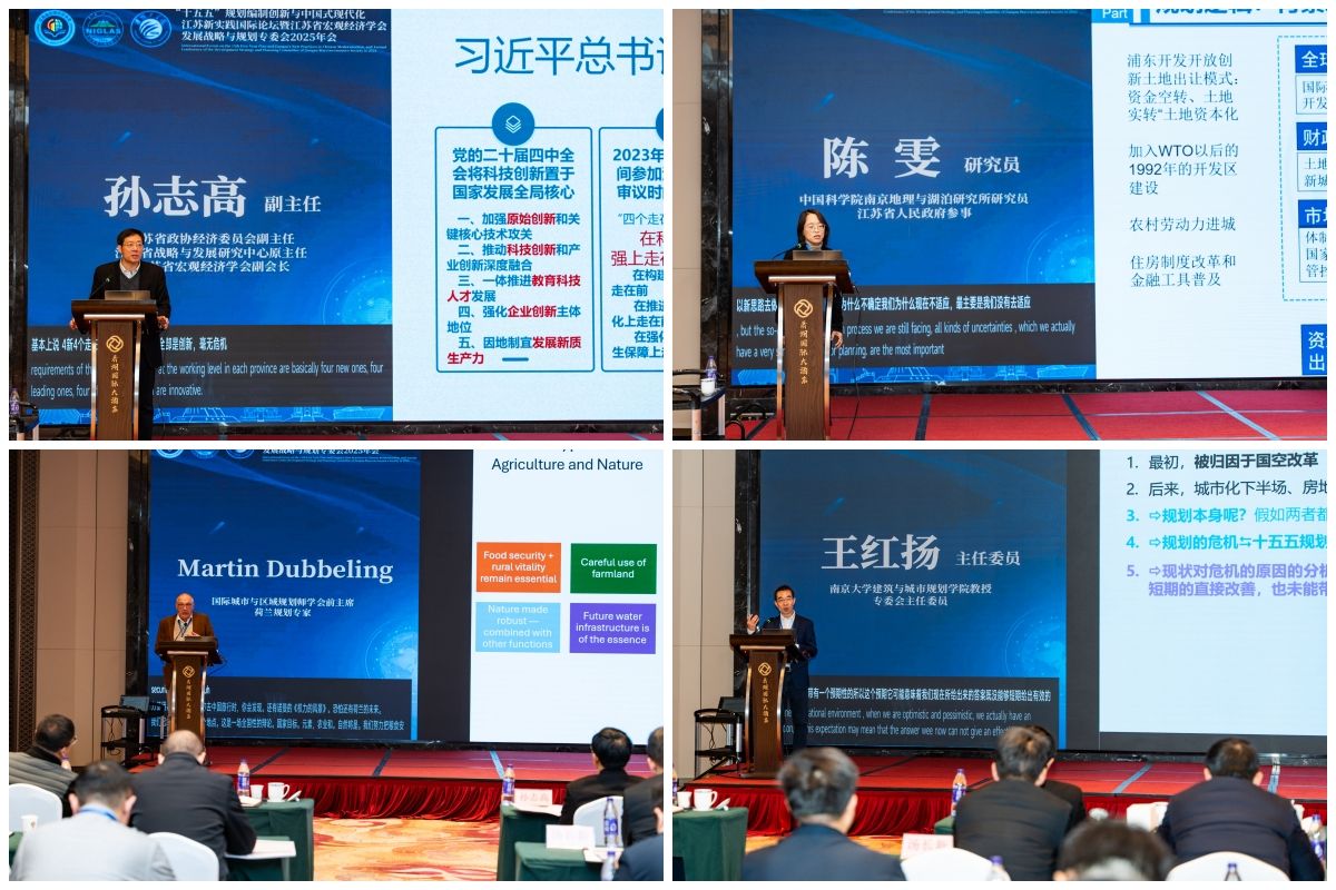 主旨报告环节,江苏省政府参事、中国科学院南京地理与湖泊研究所研究员陈雯,江苏省政协经济委员会副主任、江苏省宏观经济学会副会长孙志高,国际城市与区域规划师学会前主席Martin Dubbeling,南京大学建筑与城市规划学院教授王红扬等专家学者,围绕江苏省“十五五”规划编制的前瞻性议题、面临的挑战及国际经验借鉴作专题报告。南京大学建筑与城市规划学院教授David Shaw、江苏省规划设计集团副总经理张伟就主旨报告内容进行深入研讨,重点分析中国式现代化江苏实践的推进路径与关键挑战。