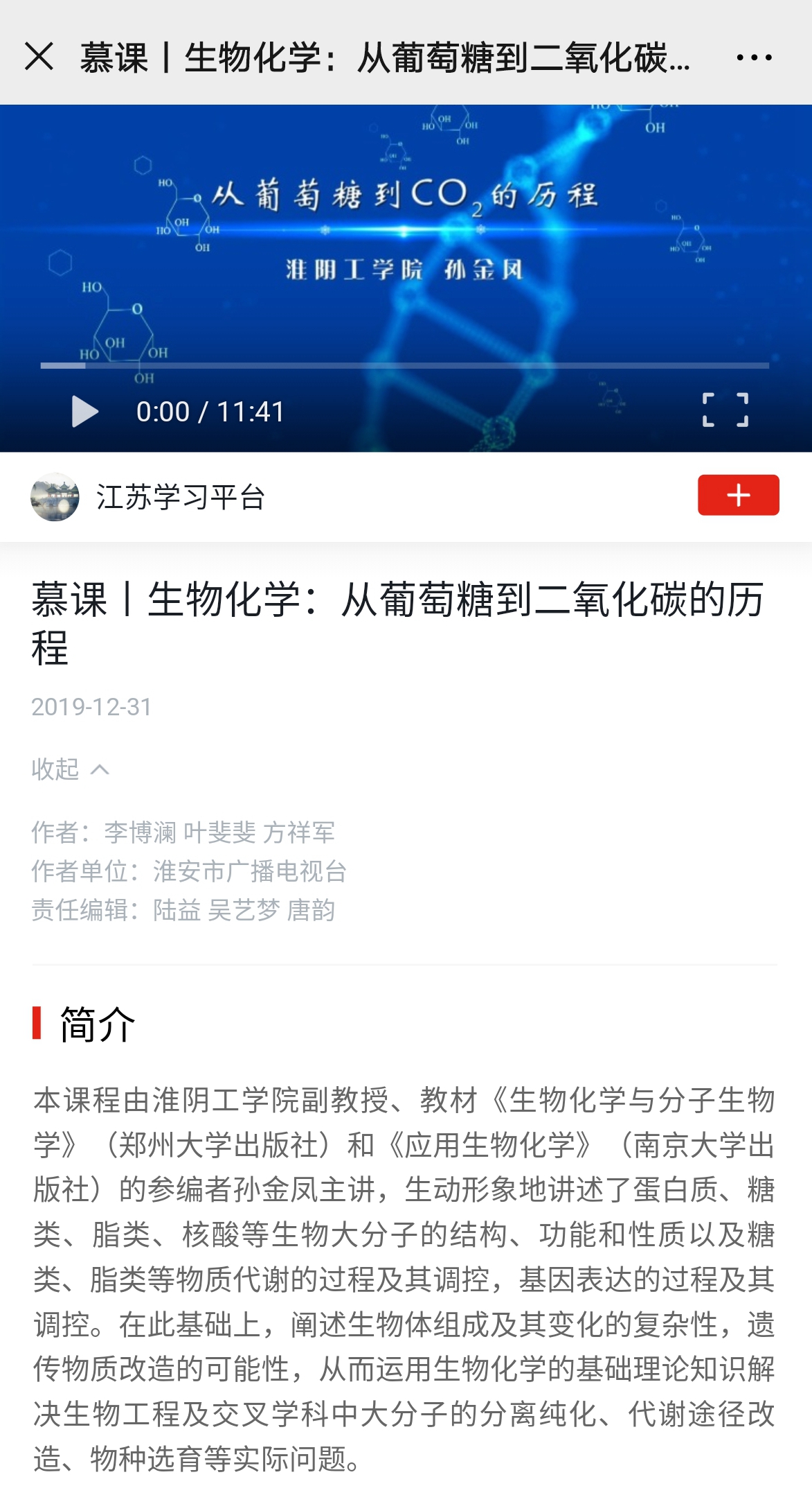 本课程由淮阴工学院副教授、教材《生物化学与分子生物学》(郑州大学出版社)和《应用生物化学》(南京大学出版社)的参编者孙金凤主讲,生动形象地讲述了蛋白质、糖类、脂类、核酸等生物大分子的结构、功能和性质以及糖类、脂类等物质代谢的过程及其调控,基因表达的过程及其调控。在此基础上,阐述生物体组成及其变化的复杂性,遗传物质改造的可能性,从而运用生物化学的基础理论知识解决生物工程及交叉学科中大分子的分离纯化、代谢途径改造、物种选育等实际问题。