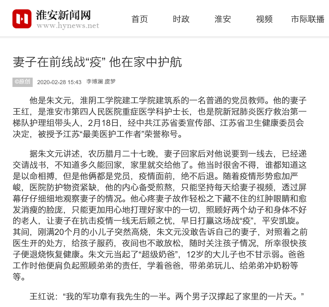 他是朱文元,淮阴工学院建工学院建筑系的一名普通的党员教师。他的妻子王红,是淮安市第四人民医院重症医学科护士长,也是院新冠肺炎医疗救治第一梯队护理组带头人,2月18日,经中共江苏省委宣传部、江苏省卫生健康委员会决定,被授予江苏“最美医护工作者”荣誉称号。