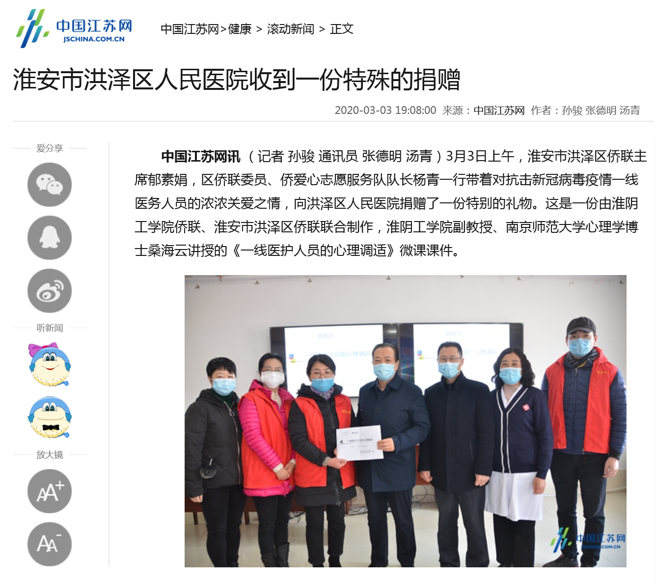 中国江苏网讯(记者 孙骏 通讯员 张德明 汤青)3月3日上午,淮安市洪泽区侨联主席郁素娟,区侨联委员、侨爱心志愿服务队队长杨青一行带着对抗击新冠病毒疫情一线医务人员的浓浓关爱之情,向洪泽区人民医院捐赠了一份特别的礼物。这是一份由淮阴工学院侨联、淮安市洪泽区侨联联合制作,淮阴工学院副教授、南京师范大学心理学博士桑海云讲授的《一线医护人员的心理调适》微课课件。