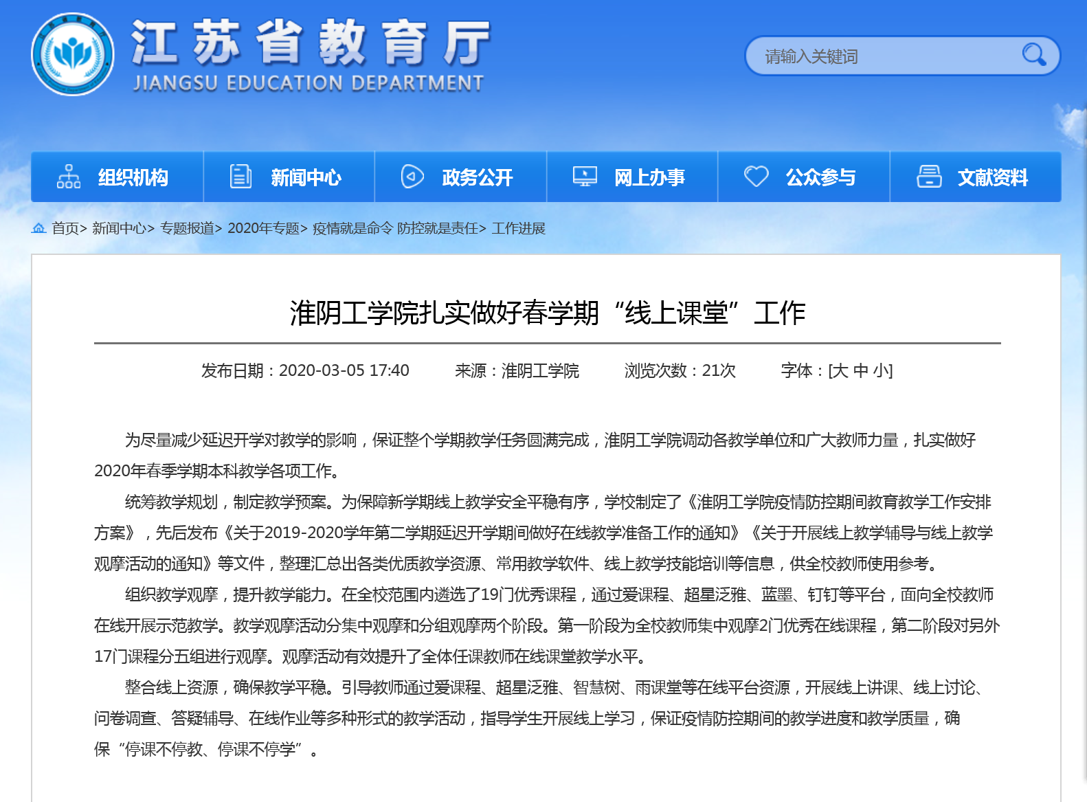 为尽量减少延迟开学对教学的影响,保证整个学期教学任务圆满完成,淮阴工学院调动各教学单位和广大教师力量,扎实做好2020年春季学期本科教学各项工作。