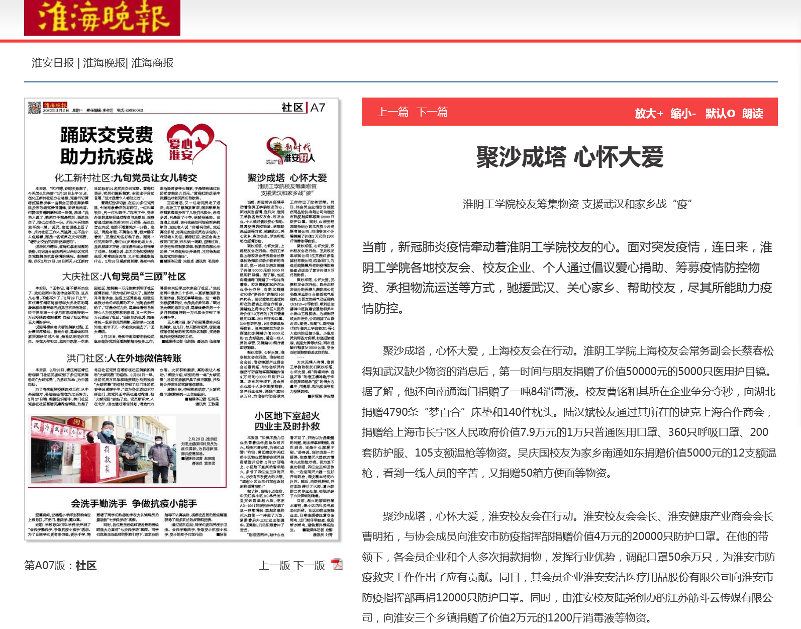聚沙成塔,心怀大爱,淮安校友会在行动。淮安校友会会长、淮安健康产业商会会长曹明拓,与协会成员向淮安市防疫指挥部捐赠价值4万元的20000只防护口罩。在他的带领下,各会员企业和个人多次捐款捐物,发挥行业优势,调配口罩50余万只,为淮安市防疫救灾工作作出了应有贡献。同日,其会员企业淮安安洁医疗用品股份有限公司向淮安市防疫指挥部再捐12000只防护口罩。同时,由淮安校友陆尧创办的江苏筋斗云传媒有限公司,向淮安三个乡镇捐赠了价值2万元的1200斤消毒液等物资。