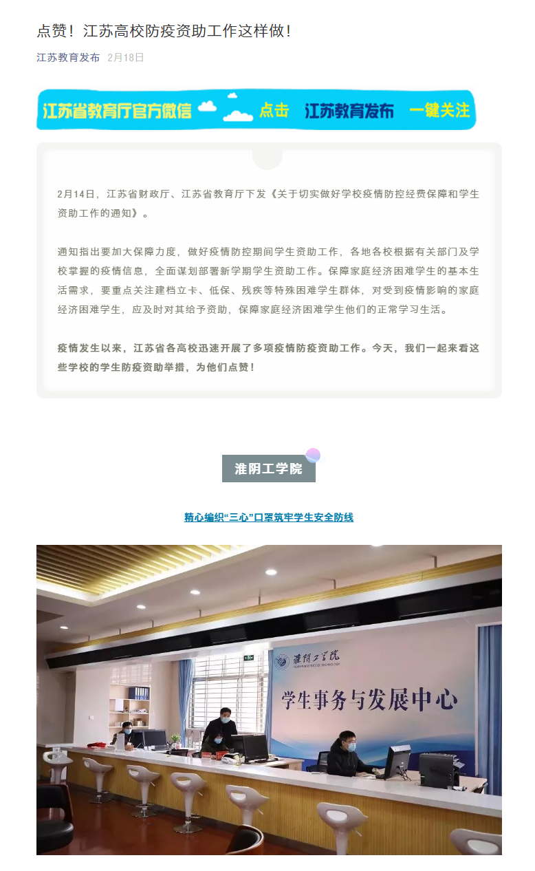 疫情发生以来,江苏省各高校迅速开展了多项疫情防疫资助工作。今天,我们一起来看这些学校的学生防疫资助举措,为他们点赞!