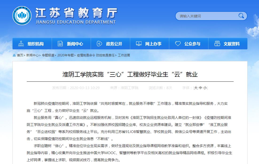 新冠肺炎疫情防控期间,淮阴工学院依据“共克时艰爱常在,就业服务不停歇”工作理念,精准落实就业指导和服务,大力实施“三心”工程,全力做好毕业生“云”就业。