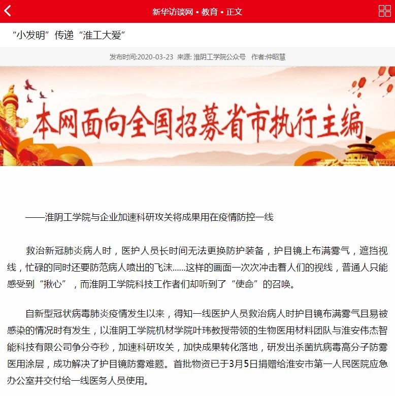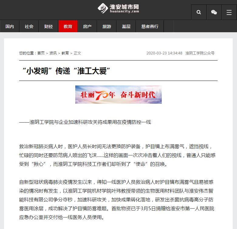 自新型冠状病毒肺炎疫情发生以来,得知一线医护人员救治病人时护目镜布满雾气且易被感染的情况时有发生,以淮阴工学院机材学院叶玮教授带领的生物医用材料团队与淮安伟杰智能科技有限公司争分夺秒,加速科研攻关,加快成果转化落地,研发出杀菌抗病毒高分子防雾医用涂层,成功解决了护目镜防雾难题。首批物资已于3月5日捐赠给淮安市第一人民医院应急办公室并交付给一线医务人员使用。