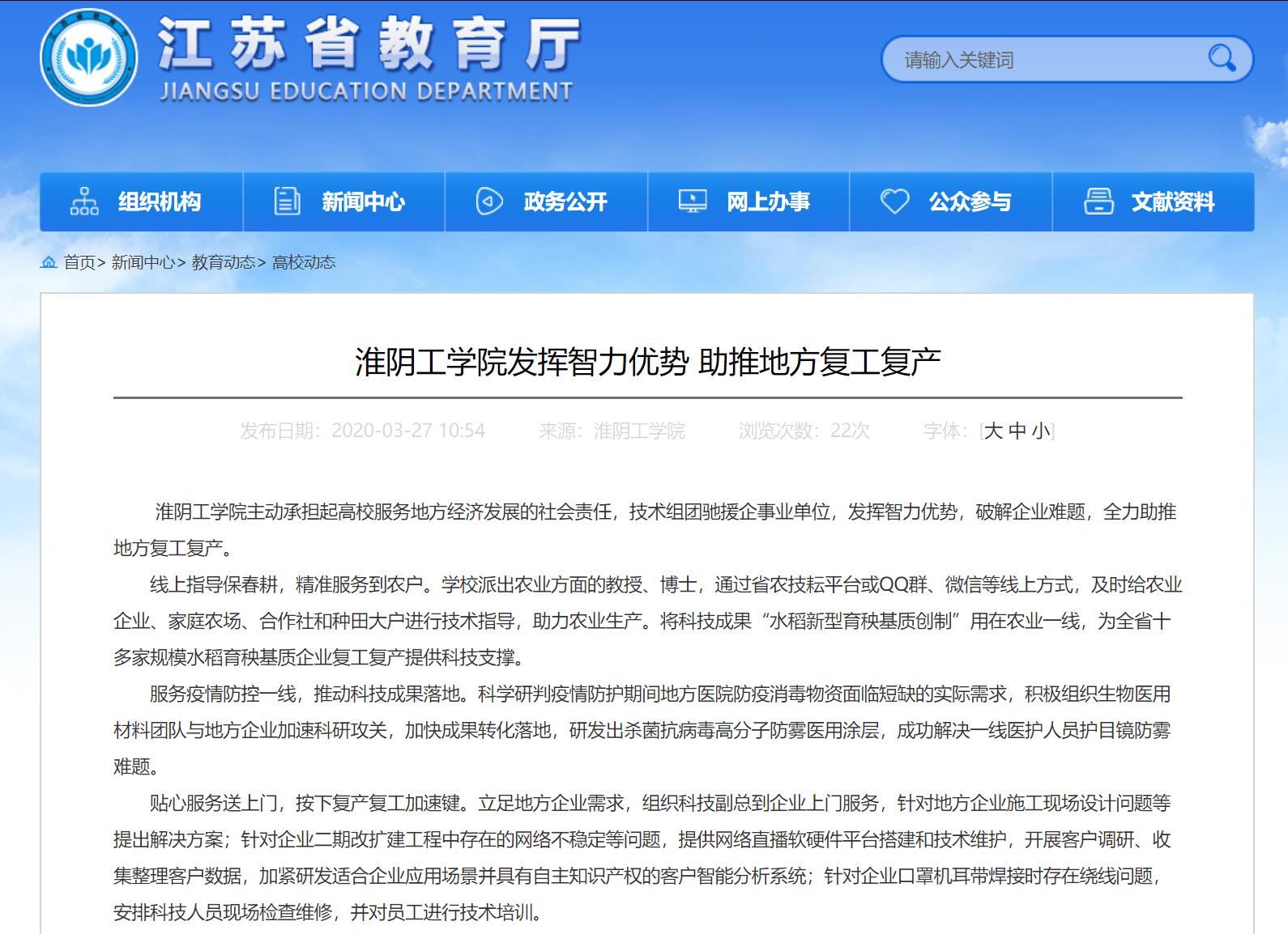 淮阴工学院主动承担起高校服务地方经济发展的社会责任,技术组团驰援企事业单位,发挥智力优势,破解企业难题,全力助推地方复工复产。