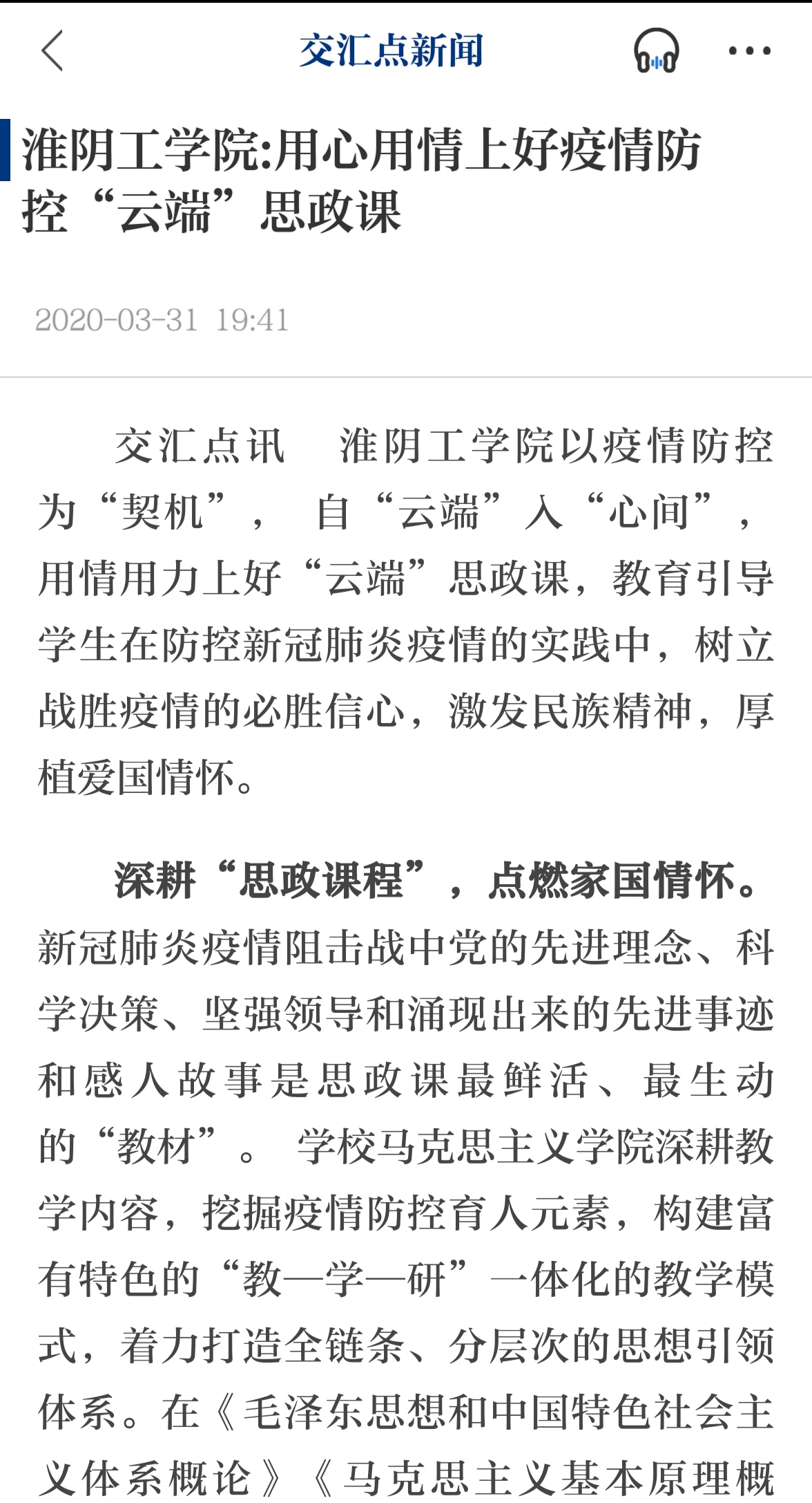 交汇点讯 淮阴工学院以疫情防控为“契机”, 自“云端”入“心间”, 用情用力上好“云端”思政课,教育引导学生在防控新冠肺炎疫情的实践中,树立战胜疫情的必胜信心,激发民族精神,厚植爱国情怀。