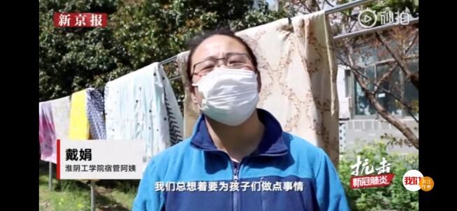 戴娟是淮阴工学院的一名宿管阿姨。疫情防控期间,由于学生无法返校,所以只要学生有需求,她都带着宿管团队每天远程为学生们解决问题:帮忙给植物浇水,帮学生寄书本寄衣服……