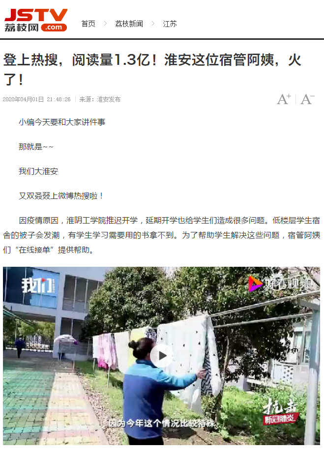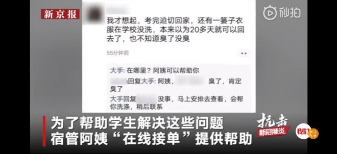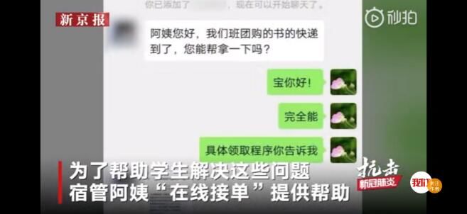 因疫情原因,淮阴工学院推迟开学,延期开学也给学生们造成很多问题。低楼层学生宿舍的被子会发潮,有学生学习需要用的书拿不到。为了帮助学生解决这些问题,宿管阿姨们“在线接单”提供帮助。