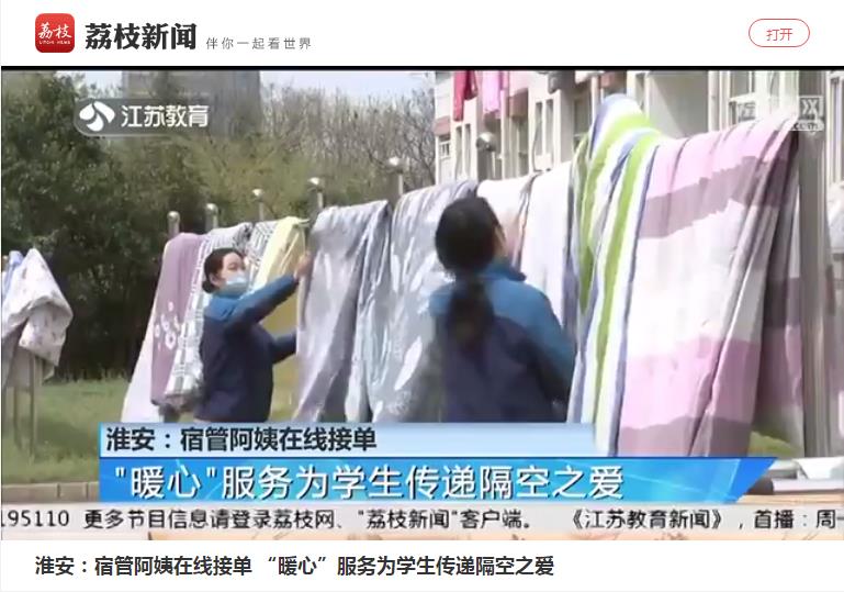 淮阴工学院宿管阿姨在线接单“暖心”服务,为学生传递隔空之爱。据宿管中心主任戴娟介绍,淮阴工学院宿管团队共有146人,现在平均每天要晒200床左右被子。为了防止出现差错,每次晒被子前都要和学生再三确认床位和做好记录、贴上标签。宿管阿姨们的暖心贴心服务也收获了不少学生的隔空表白,学生们都亲切地叫她们“戴妈”“黄妈”。除了晾晒被子,宿管阿姨们还帮学生们给绿植浇水、寄送物品,提供全方位暖心服务。