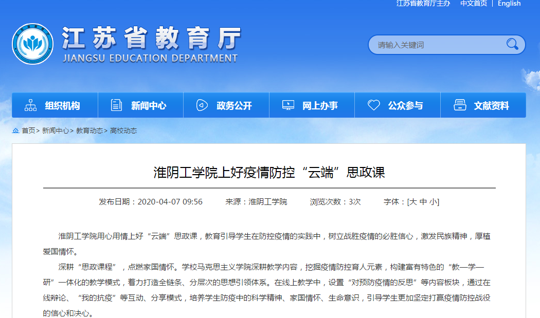淮阴工学院用心用情上好“云端”思政课,教育引导学生在防控疫情的实践中,树立战胜疫情的必胜信心,激发民族精神,厚植爱国情怀。