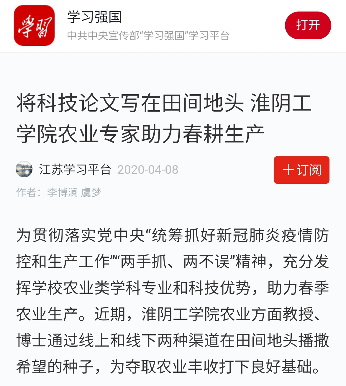 疫情防控期间,淮阴工学院农业科技人员线上线下齐发力,及时给农业企业、家庭农场、合作社和种田大户送去“技术大餐”,将科技论文写在田间地头,为助力农业春耕复产贡献淮工智慧。