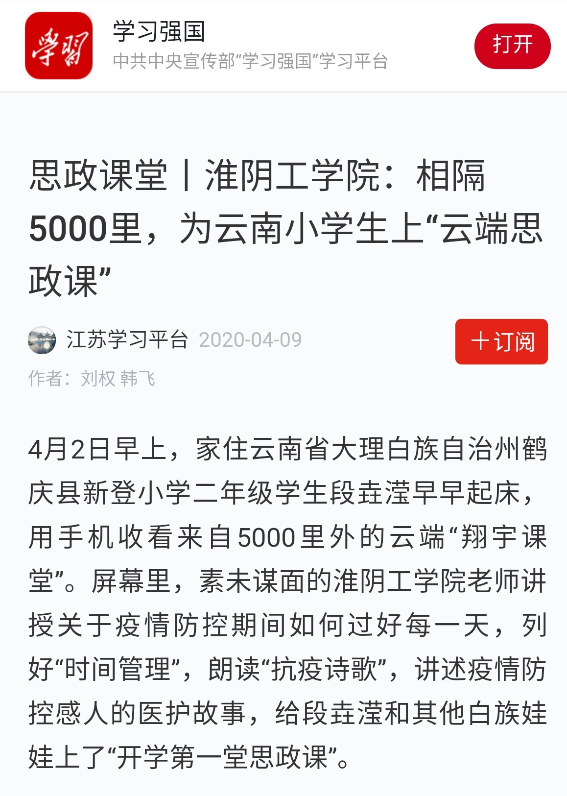4月2日早上,家住云南省大理白族自治州鹤庆县新登小学二年级学生段垚滢早早起床,用手机收看来自5000里外的云端“翔宇课堂”。屏幕里,素未谋面的淮阴工学院老师讲授关于疫情防控期间如何过好每一天,列好“时间管理”,朗读“抗疫诗歌”,讲述疫情防控感人的医护故事,给段垚滢和其他白族娃娃上了“开学第一堂思政课”。