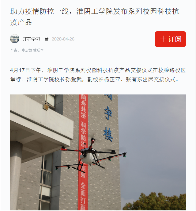 该校机械与材料学院无人机研究所的杜思亮团队,从事无人机相关研究已有8年,带领学生获得国内国际大奖30余项,此次自主研发了弥雾消杀无人车和喷洒消杀无人机;电信工程学院曹苏群团队研发的遥控自行走消毒液喷雾智能机器人,实现了超细雾化,提高了消毒效果,超低噪音,能做到不影响学生上课;机械与材料学院机器人协会的周仁和团队,从事无人机相关研究已近10年,带领学生获得国内国际大奖百余项,此次开发的智能测温机器人将用于校园入口处等地的无接触测体温,可快速实现无接触测温、预警提示、语音播报、智能健康识别等功能,连续24小时不间断作业,极大减轻了保卫人员的工作强度;机械与材料学院省医用材料及高端医疗器械工程研究中心的叶玮团队,一直从事医用材料的研究,此次研发的新型防雾医用护目镜,可用于校医护人员的防护镜以及佩戴眼镜的工作人员及学生等,该项产品已捐赠给淮安市第一人民医院,交付给一线医务人员使用;设计艺术学院汤海英团队,通过抗疫木刻版画作品《全民战疫》及海报衍生产品借用网媒、报刊等多元平台,把抗“疫”中逆行的英雄、全民团结、坚守家园等情感以刻画呈现,该艺术品可有效加强学校在科技工作中的防疫宣传效果。目前,5项成果已交付学校相关部门使用,正积极推介到地方,助力地方疫情防控一线。