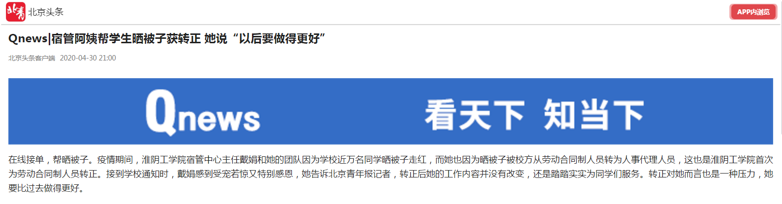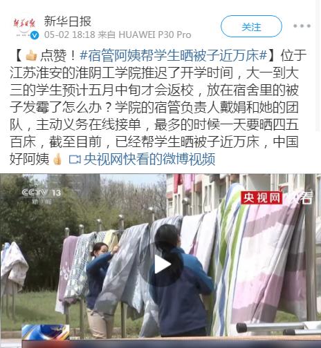 下一条:中央电视台:江苏淮安 帮学生晒被子近万床 贴心宿管阿姨获赞