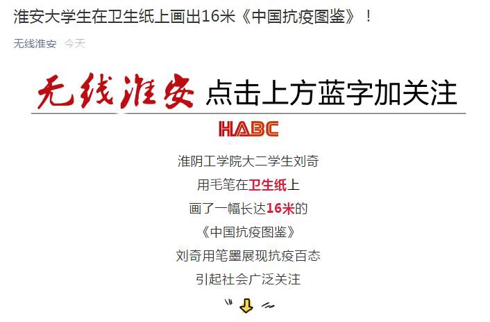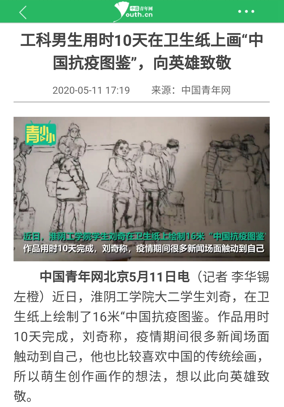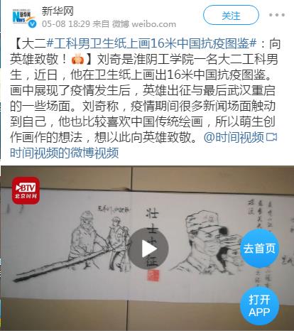 刘奇是淮阴工学院一名大二工科男生,近日,他在卫生纸上画出16米中国抗疫图鉴。刘奇称,疫情期间很多新闻场面触动到自己,他也比较喜欢中国的传统绘画,所以萌生创作画作的想法,想以此向英雄致敬。