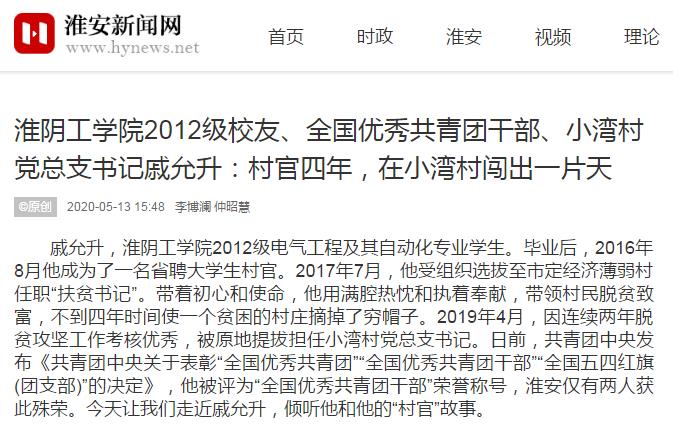 戚允升,淮阴工学院2012级电气工程及其自动化专业学生。毕业后,2016年8月他成为了一名省聘大学生村官。2017年7月,他受组织选拔至市定经济薄弱村任职“扶贫书记”。带着初心和使命,他用满腔热忱和执着奉献,带领村民脱贫致富,不到四年时间使一个贫困的村庄摘掉了穷帽子。2019年4月,因连续两年脱贫攻坚工作考核优秀,被原地提拔担任小湾村党总支书记。日前,共青团中央发布《共青团中央关于表彰“全国优秀共青团”“全国优秀共青团干部”“全国五四红旗(团支部)”的决定》,他被评为“全国优秀共青团干部”荣誉称号,淮安仅有两人获此殊荣。今天让我们走近戚允升,倾听他和他的“村官”故事。