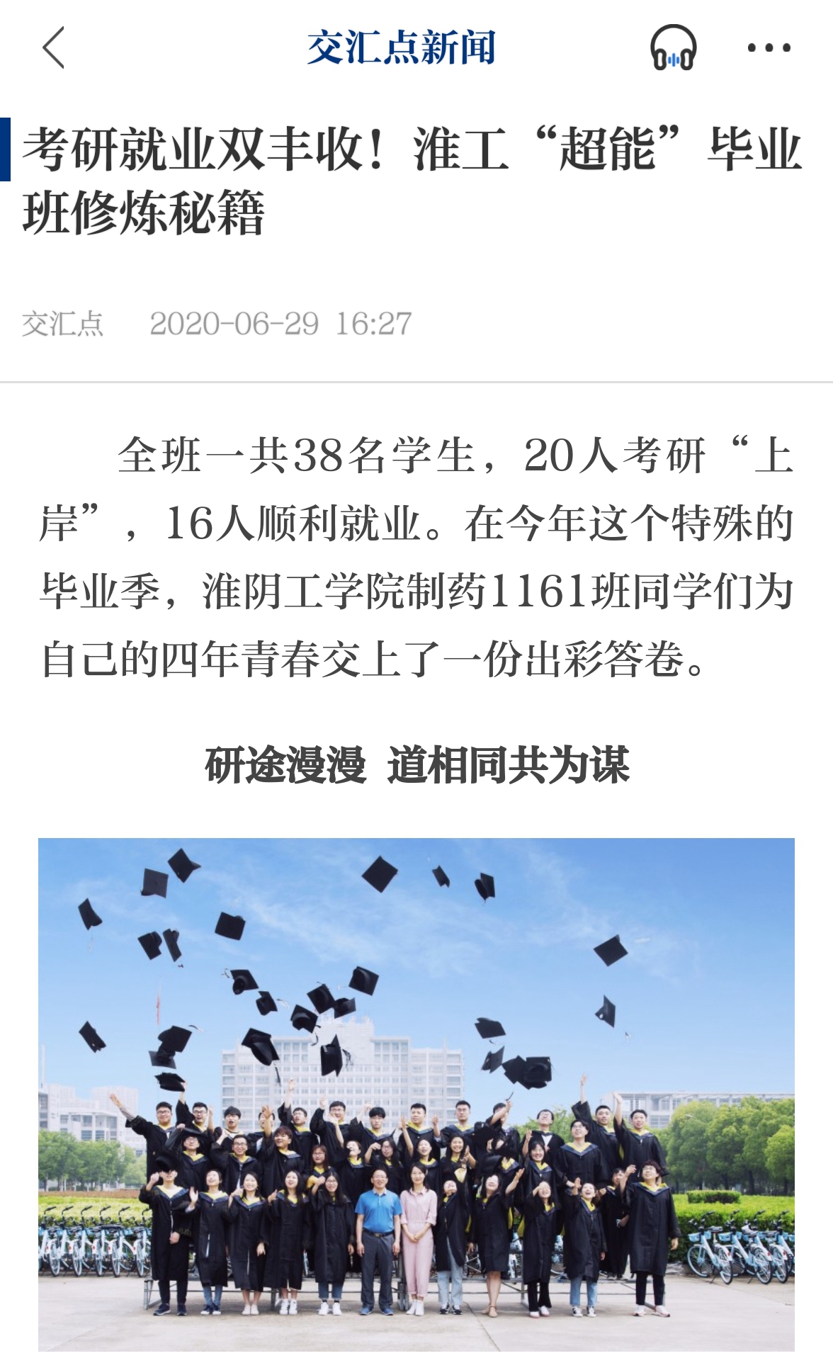 全班一共38名学生,20人考研“上岸”,16人顺利就业。在今年这个特殊的毕业季,淮阴工学院制药1161班同学们为自己的四年青春交上了一份出彩答卷。