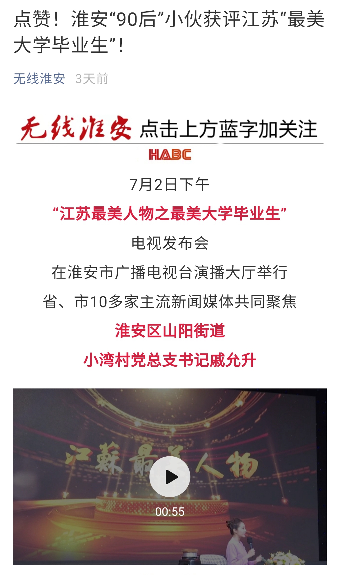 7月2日下午“江苏最美人物之最美大学毕业生”电视发布会在淮安市广播电视台演播大厅举行省、市10多家主流新闻媒体共同聚焦我校2012级校友、淮安区山阳街道小湾村党总支书记戚允升。