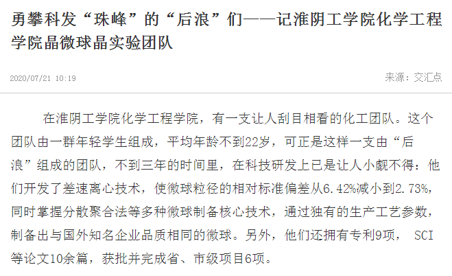 在淮阴工学院化学工程学院,有一支让人刮目相看的化工团队。这个团队由一群年轻学生组成,平均年龄不到22岁,可正是这样一支由“后浪”组成的团队,不到三年的时间里,在科技研发上已是让人小觑不得:他们开发了差速离心技术,使微球粒径的相对标准偏差从6.42%减小到2.73%,同时掌握分散聚合法等多种微球制备核心技术,通过独有的生产工艺参数,制备出与国外知名企业品质相同的微球。另外,他们还拥有专利9项, SCI等论文10余篇,获批并完成省、市级项目6项。