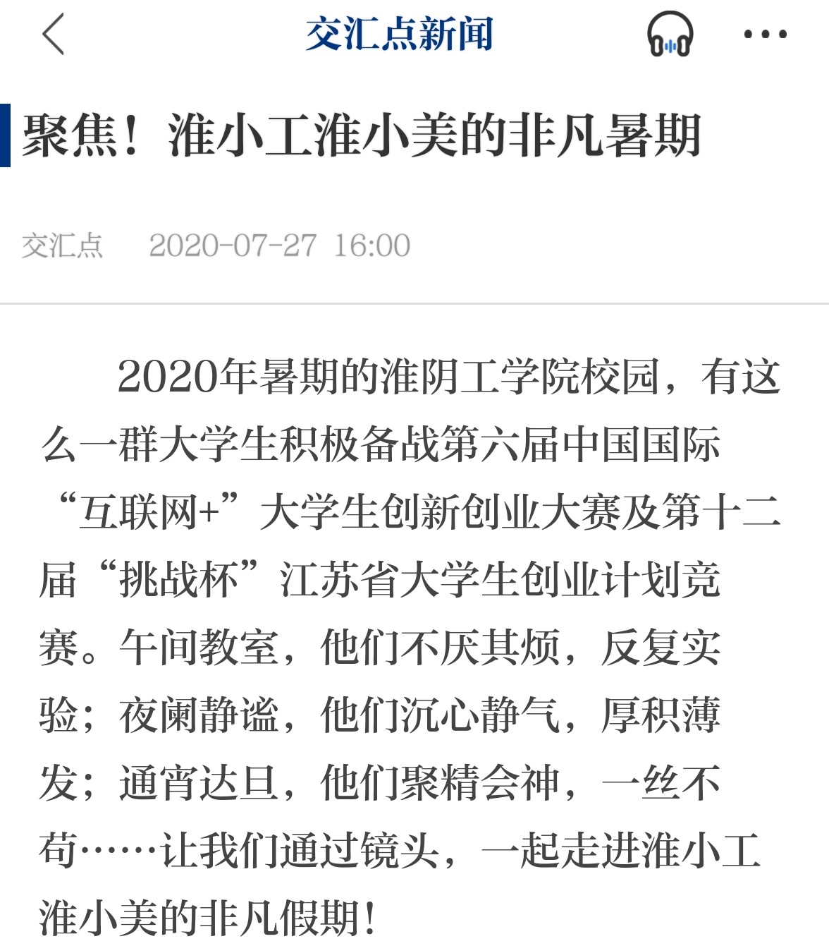 编者按:2020年暑期的淮工校园,有这么一群大学生积极备战第六届中国国际“互联网+”大学生创新创业大赛及第十二届“挑战杯”江苏省大学生创业计划竞赛。午间教室,他们不厌其烦,反复实验;夜阑静谧,他们沉心静气,厚积薄发;通宵达旦,他们聚精会神,一丝不苟……近日,宣传部(新闻中心)记者走近他们,用镜头记录下他们挥洒汗水的身影与青春奋斗的足迹。习近平总书记说:“科技是国家强盛之基,创新是民族进步之魂。”挥洒青春汗水,勇攀科技高峰,让我们一起走进淮小工淮小美的非凡假期!
