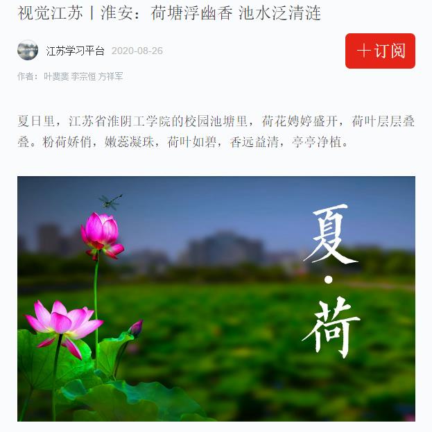 夏日里,江苏省淮阴工学院的校园池塘里,荷花娉婷盛开,荷叶层层叠叠。粉荷娇俏,嫩蕊凝珠,荷叶如碧,香远益清,亭亭净植。