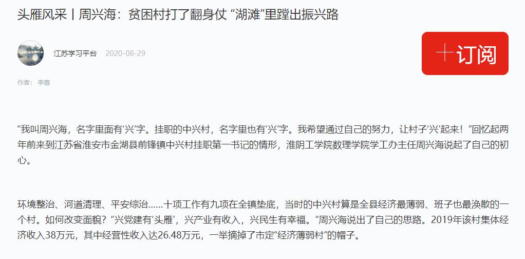 “我叫周兴海,名字里面有‘兴’字。挂职的中兴村,名字里也有‘兴’字。我希望通过自己的努力,让村子‘兴’起来!”回忆起两年前来到金湖县前锋镇中兴村挂职第一书记的情形,淮阴工学院数理学院学工办主任周兴海说起了自己的初心。