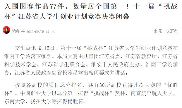 按照各高校的项目总分排名,共有30所高校获得此次大赛的“优胜杯”。中国矿业大学以总分第一捧得“挑战杯”奖杯,南京航空航天大学、东南大学、扬州大学等捧得优胜杯。