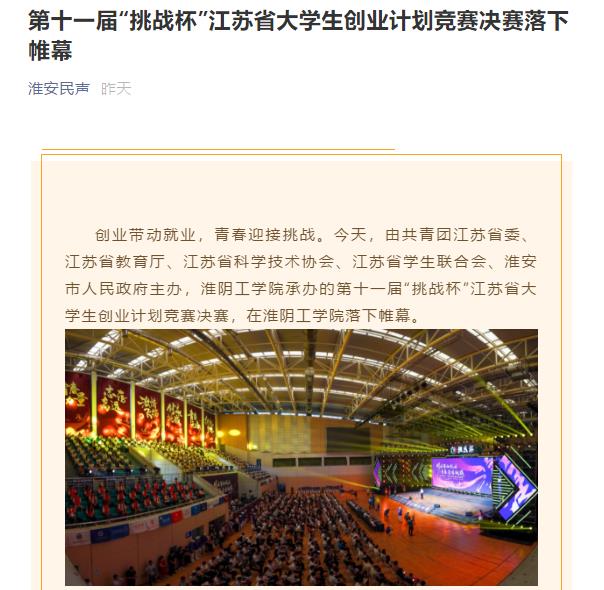创业带动就业,青春迎接挑战。由共青团江苏省委、江苏省教育厅等部门主办第十一届“挑战杯”江苏省大学生创业计划竞赛决赛,今天,在江苏淮安淮阴工学院落下帷幕。
