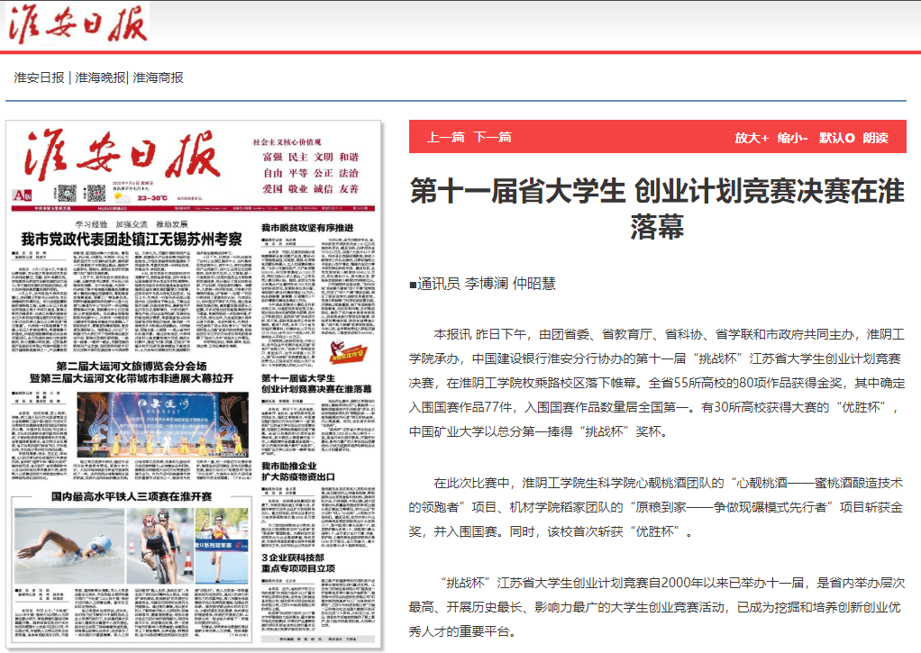 在此次比赛中,淮阴工学院生科学院心靓桃酒团队的“心靓桃酒——蜜桃酒酿造技术的领跑者”项目、机材学院稻家团队的“原粮到家——争做现碾模式先行者”项目斩获金奖,并入围国赛。同时,该校首次斩获“优胜杯”。