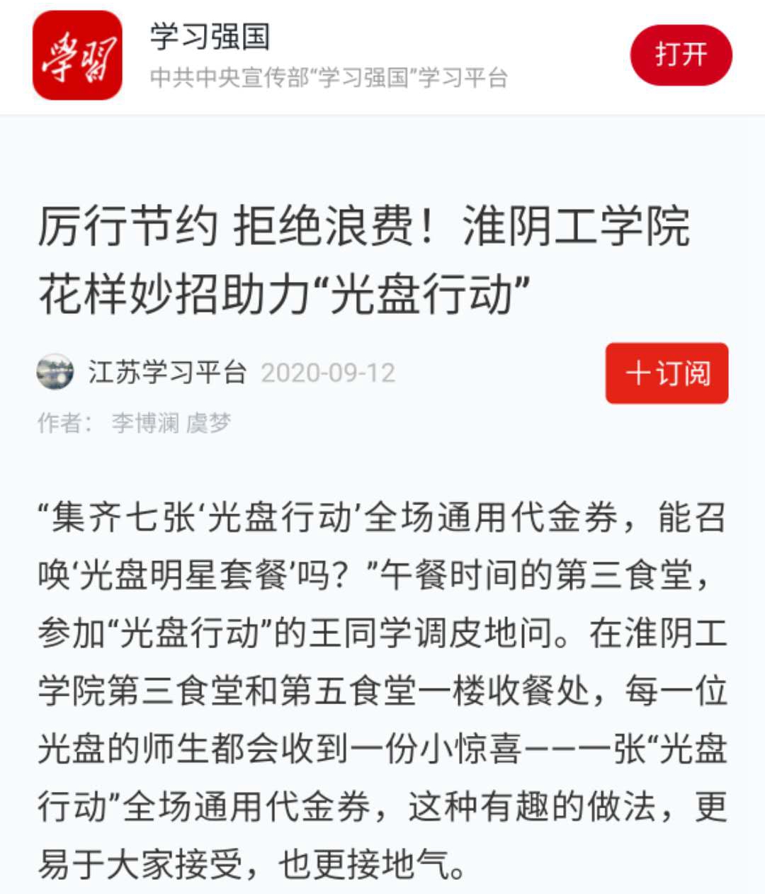 厉行节约永远在路上,遏制校园浪费贵在坚持,勤俭节约办教育、建设节约型校园,关键在持续深入。通过强化“过紧日子”的意识、自觉抵制餐饮浪费行为,淮阴工学院将勤俭节约的观念根植师生心中,让“浪费可耻、节约为荣”在校园蔚然成风。