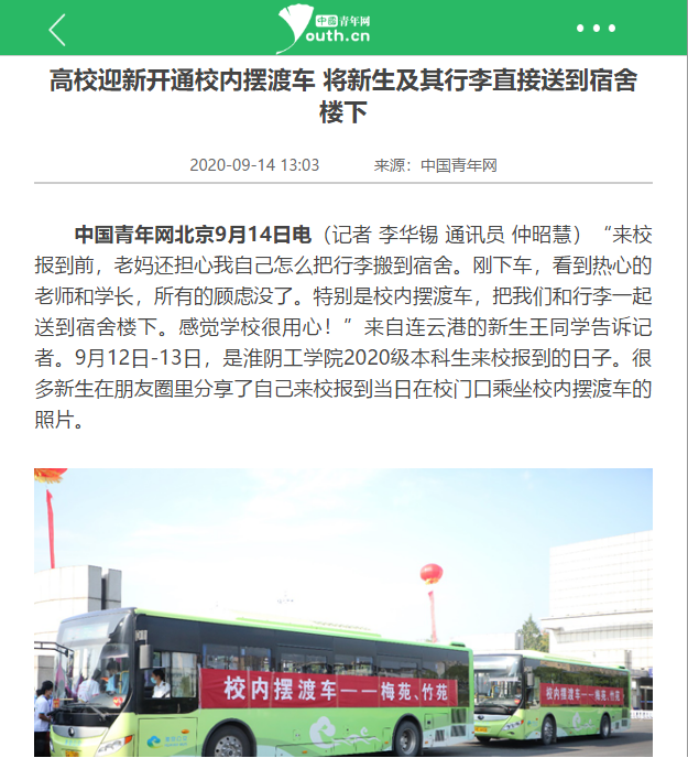 中国青年网北京9月14日电(记者 李华锡 通讯员 仲昭慧)“来校报到前,老妈还担心我自己怎么把行李搬到宿舍。刚下车,看到热心的老师和学长,所有的顾虑没了。特别是校内摆渡车,把我们和行李一起送到宿舍楼下。感觉学校很用心!”来自连云港的新生王同学告诉记者。9月12日-13日,是淮阴工学院2020级本科生来校报到的日子。很多新生在朋友圈里分享了自己来校报到当日在校门口乘坐校内摆渡车的照片。