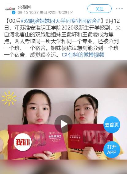 【00后#双胞胎姐妹同大学同专业同宿舍#】9月12日,江苏淮安淮阴工学院2020级新生开学报到,来自河北唐山的双胞胎姐妹王紫轩和王紫凌成为焦点。两人考取同一所大学和同一个专业,还被分到一个班、一个宿舍。姐妹俩称没想到能分到一个班一个宿舍,感觉很幸运。