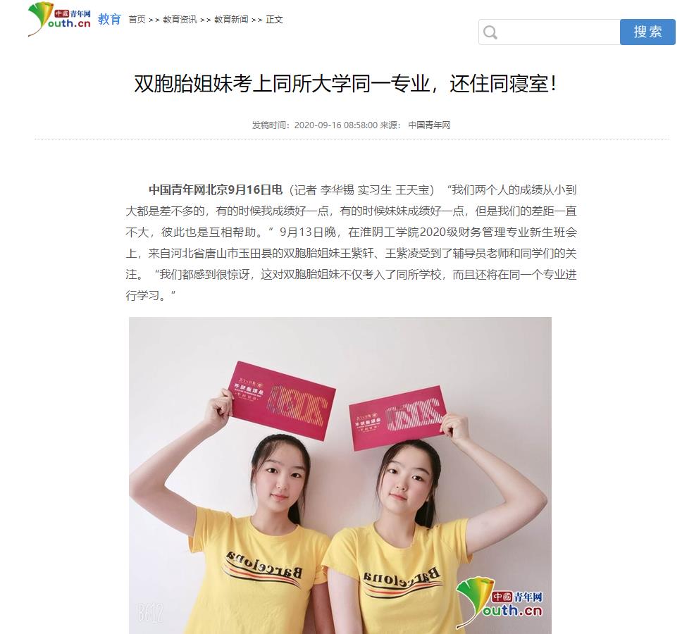 中国青年网北京9月16日电(记者 李华锡 实习生 王天宝)“我们两个人的成绩从小到大都是差不多的,有的时候我成绩好一点,有的时候妹妹成绩好一点,但是我们的差距一直不大,彼此也是互相帮助。”9月13日晚,在淮阴工学院2020级财务管理专业新生班会上,来自河北省唐山市玉田县的双胞胎姐妹王紫轩、王紫凌受到了辅导员老师和同学们的关注。“我们都感到很惊讶,这对双胞胎姐妹不仅考入了同所学校,而且还将在同一个专业进行学习。”