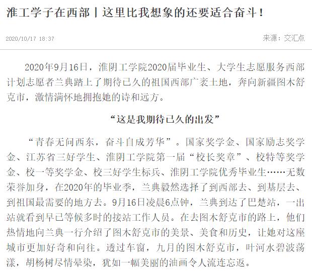 2020年9月16日,淮阴工学院2020届毕业生、大学生志愿服务西部计划志愿者兰典踏上了期待已久的祖国西部广袤土地,奔向新疆图木舒克市,激情满怀地拥抱她的诗和远方。