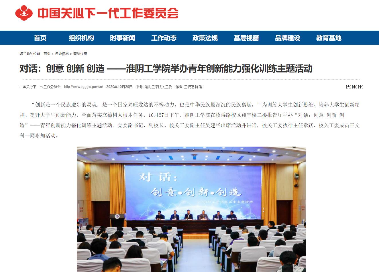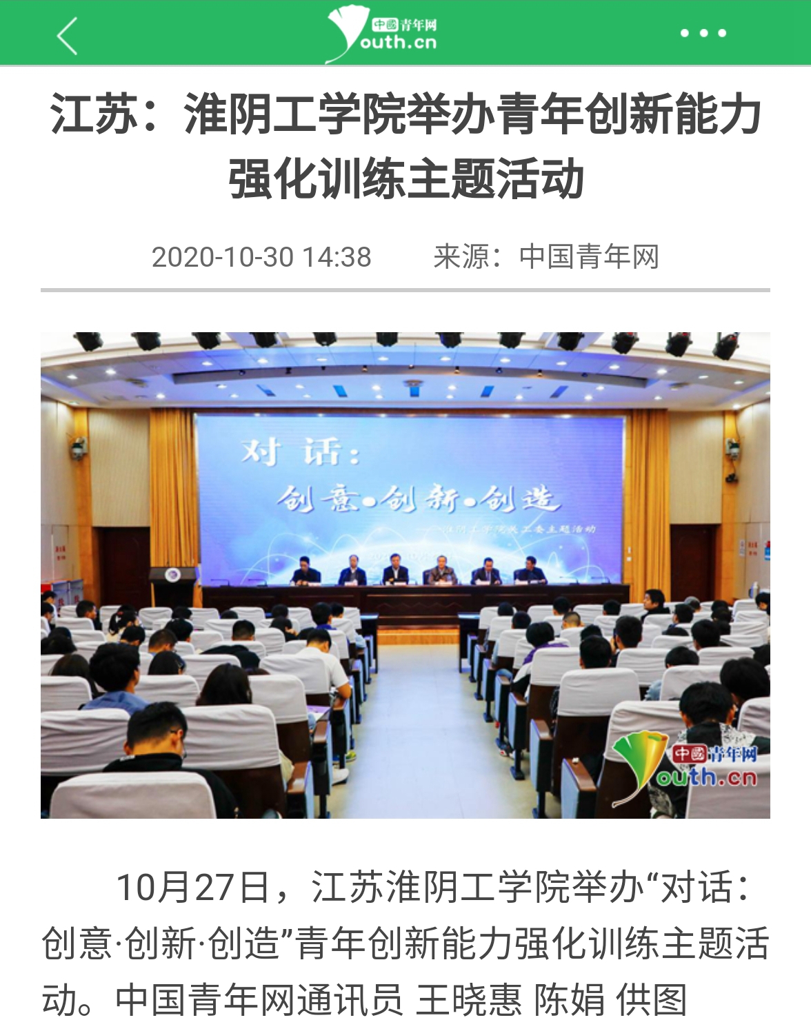 10月27日,江苏淮阴工学院举办“对话:创意·创新·创造”青年创新能力强化训练主题活动。中国青年网通讯员 王晓惠 陈娟 供图