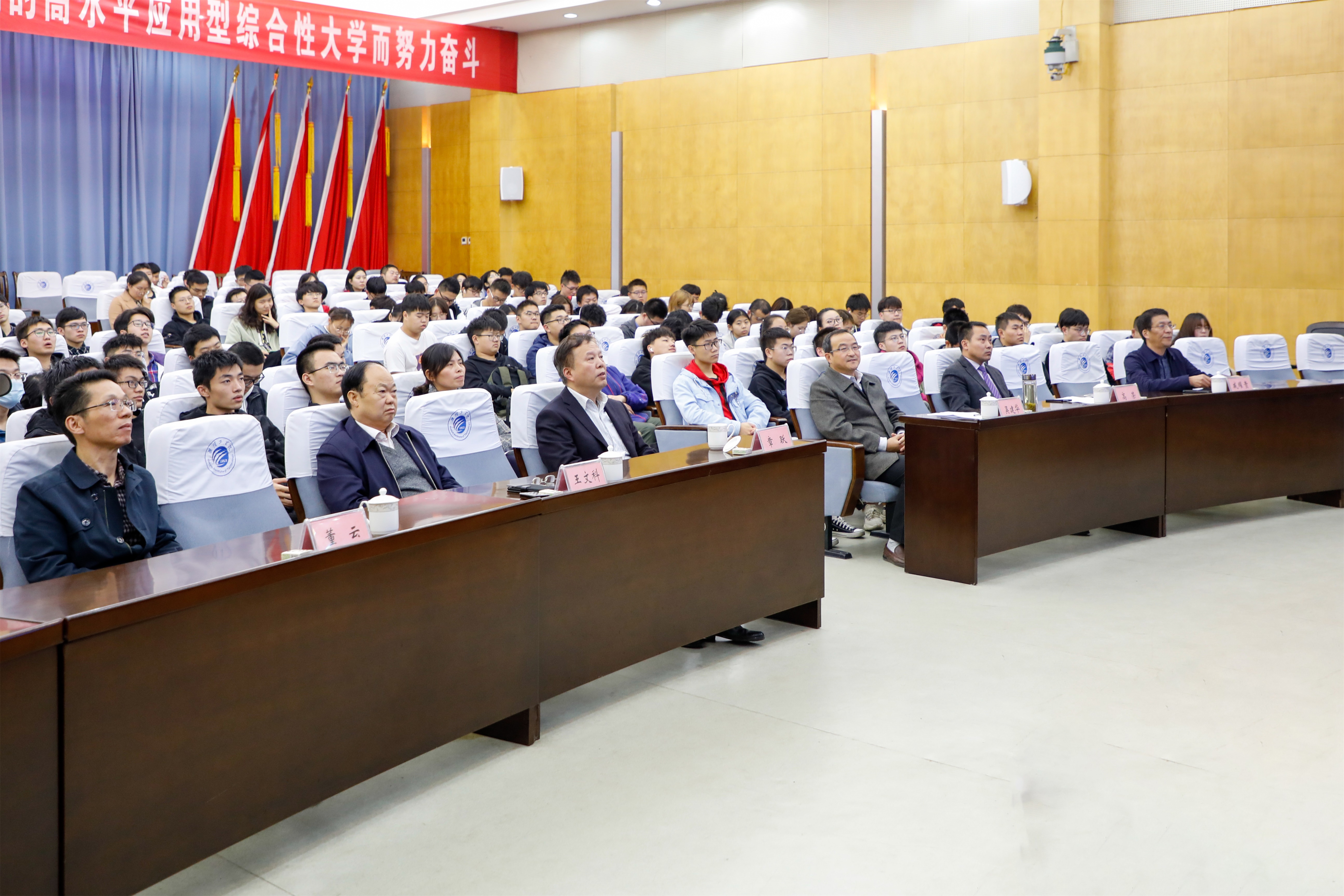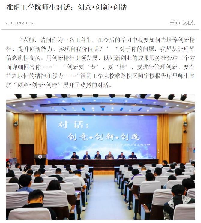 “老师,请问作为一名工科生,在今后的学习中我要如何去培养创新精神、提升创新能力、实现自我价值呢?” “对于你的问题,我想从让理想信念旗帜高扬、用创新精神引领发展、以创新创业的成果服务社会这三个方面详细回答你……” “创新要‘专’、要‘精’、要进行管理创新、要有持之以恒的精神和毅力……”淮阴工学院枚乘路校区翔宇楼报告厅里师生围绕“创意•创新•创造”展开了热烈的对话。