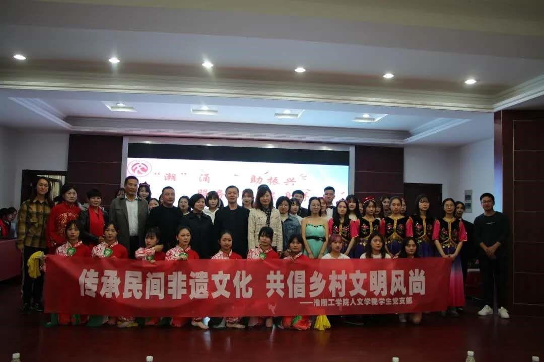 在漕运镇礼堂里,人文学院学生党支部为近200名村民呈现了一场精彩的文艺演出,赢得了村民的阵阵掌声。
