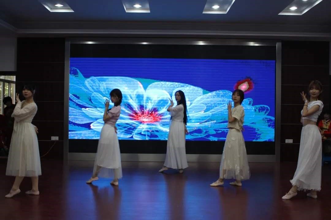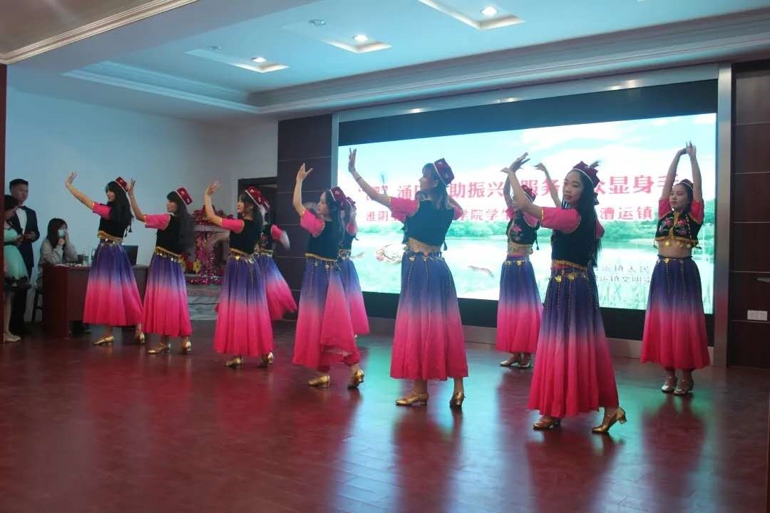 演出以富有民族特色的新疆舞开场,舞者们灵动的身姿和如火的热情点燃了现场气氛。充满青春活力的的抖音舞《风花》、现代舞《再出发》、小合唱《你是对的人》让当地的村民感受到当代大学生的蓬勃朝气。当地群众艺术团带来了南闸民歌《梳妆台》,以其委婉、悠慢、抒情的演唱特色,让大学生们感受到地方非遗文化的独具魅力。最后,同学们的扇子舞《在希望的田野上》为文艺演出画上了圆满的句号。