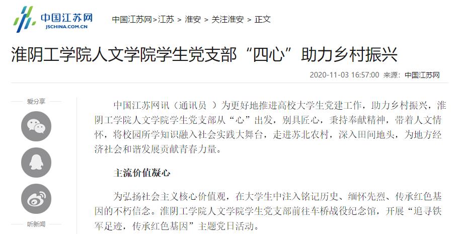 中国江苏网讯 为更好地推进高校大学生党建工作,助力乡村振兴,淮阴工学院人文学院学生党支部从“心”出发,别具匠心,秉持奉献精神,带着人文情怀,将校园所学知识融入社会实践大舞台,走进苏北农村,深入田间地头,为地方经济社会和谐发展贡献青春力量。