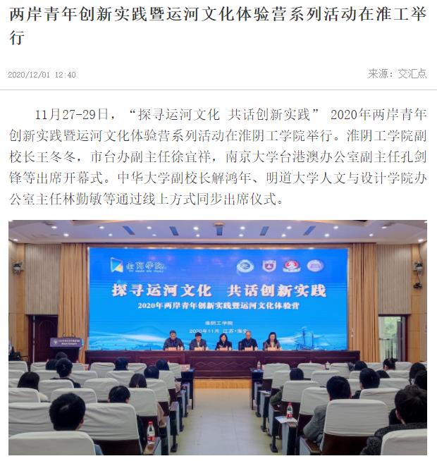 11月27-29日,“探寻运河文化 共话创新实践”2020年两岸青年创新实践暨运河文化体验营系列活动在淮阴工学院举行。淮阴工学院副校长王冬冬,市台办副主任徐宜祥,南京大学台港澳办公室副主任孔剑锋等出席开幕式。中华大学副校长解鸿年、明道大学人文与设计学院办公室主任林勤敏等通过线上方式同步出席仪式。